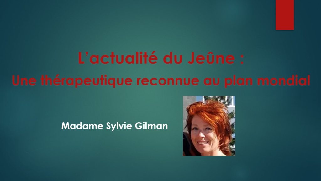 Le documentaire écrit et réalisé en 2011 « Le Jeûne, une nouvelle thérapie », déjà passé neuf fois sur ARTE, est en cours de réactualisation : Alors que l’espérance de vie s’accroît dans les pays occidentaux, les cas de diabète, d’hypertension, d’obésité, de cancers se multiplient ; la consommation de médicaments explose. Depuis un demi-siècle, en Allemagne, en Russie ou aux États-Unis, des médecins et des biologistes explorent une autre piste : le jeûne. Les résultats sont étonnants. De jeunes biologistes de l’université de Los Angeles renversent les idées reçues et démontrent par la biologie moléculaire les puissants effets du jeûne. Ils ouvrent de nombreuses perspectives, y compris dans le traitement du cancer. Si ces scientifiques ont raison, c’est peut-être notre approche de la maladie et du soin qu’il faudrait repenser. Sylvie GILMAN nous parle d’autres témoignages qui viennent d’être enregistrés pour réaliser une version actualisée de ce documentaire.